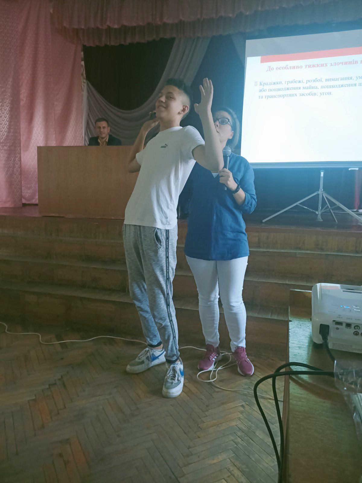 Дарина Гончарова розпочала свій виступ з ознайомлення молодих людей знаннями законів про актуальні питання прав підлітків, а також звернула увагу на те, на яку допомогу може розраховувати молодь. Згадала також про види відповідальності для неповнолітніх та з якого віку вона наступає. Що таке ВІДНОВЛЕНЕ ПРАВОСУДДЯ і хто на нього може розраховувати. Особлива увага приділялась питанню про тяжкі злочини і про те, як їх розрізняти. Це все було продемонстровано практично.