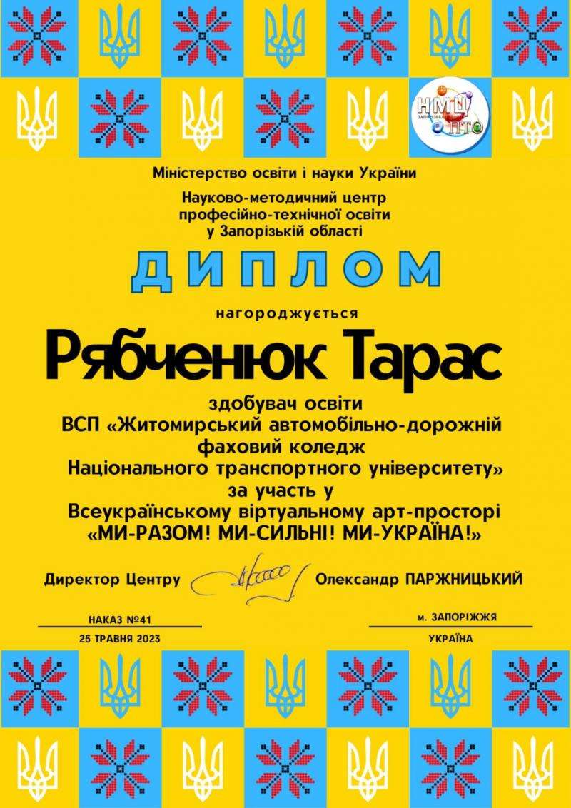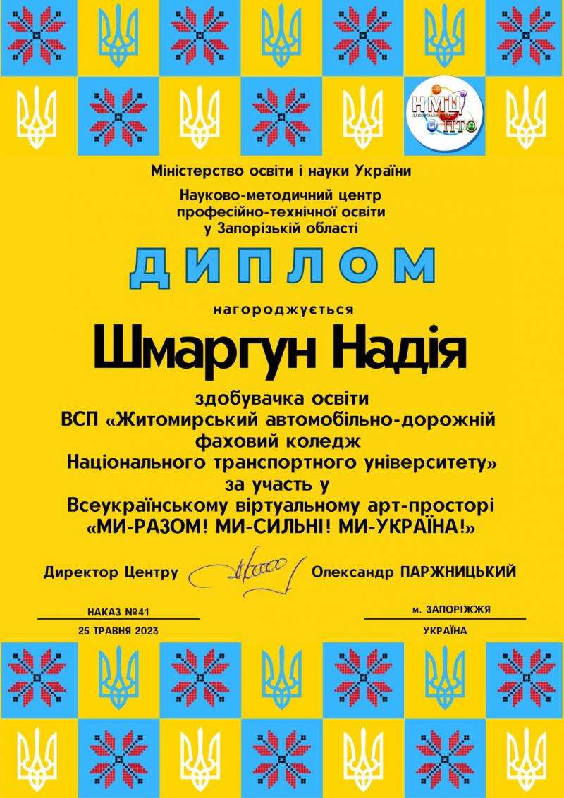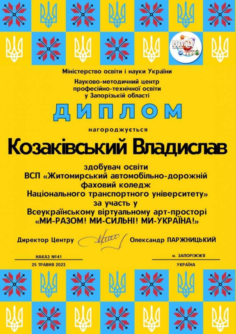 25 травня 2023 року на запрошення Науково-методичного центру професійно-технічної освіти у Запорізькій області студенти ВСП ЖАДФК НТУ Надія Шмаргун, Тарас Рябченюк, Владислав Козаківський та Євгеній Шевченко під керівництвом викладачів Олени Умінської та Ольги Галкіної взяли участь у Всеукраїнському віртуальному арт-просторі «Ми-сильні! Ми-разом! Ми-Україна!».