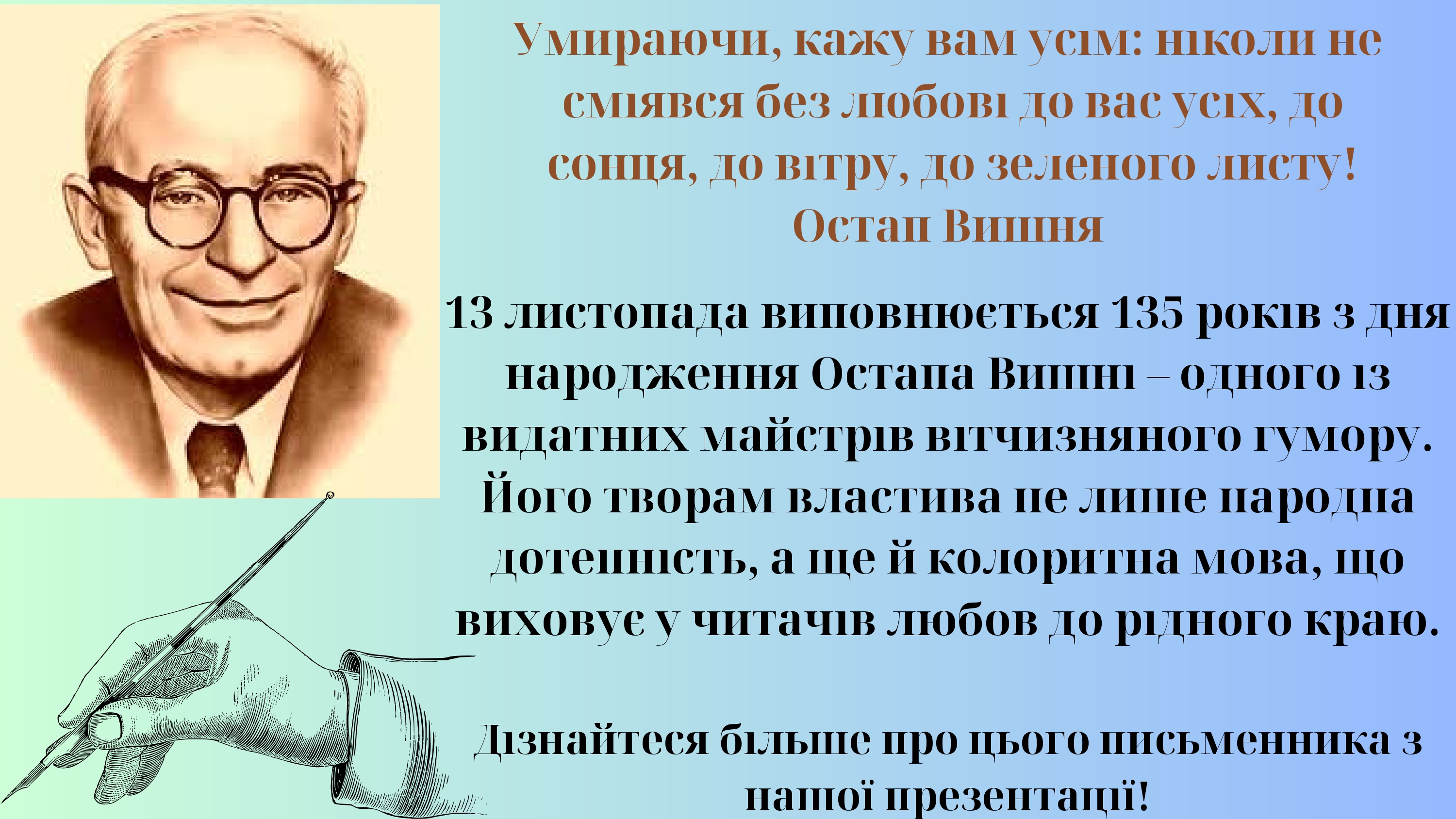 Остап Вишня – першопроходець жанру усмішки. Віртуальна книжкова виставка до дня народження відомого українського письменника і новеліста Остапа Вишні (Павло Михайлович Губенко)