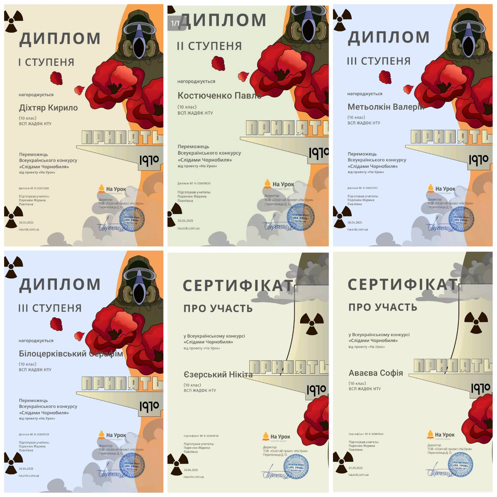 З метою вшанування жертв Чорнобильської катастрофи, студенти групи 1Р-1158 під керівництвом викладача Марини Паренюк взяли участь у Всеукраїнському конкурсі від платформи На урок «Слідами Чорнобиля». Здобувачі освіти закріпили знання про чорнобильську трагедію, а також цей конкурс допоміг розвивати почуття вдячності, вшанування подвигу, виховувати почуття поваги до своєї Батьківщини – України, почуття глибокої поваги до людей, які ціною власного життя та здоров’я захищали Україну від наслідків аварії на ЧАЕС, сприяти розвитку особистості.
