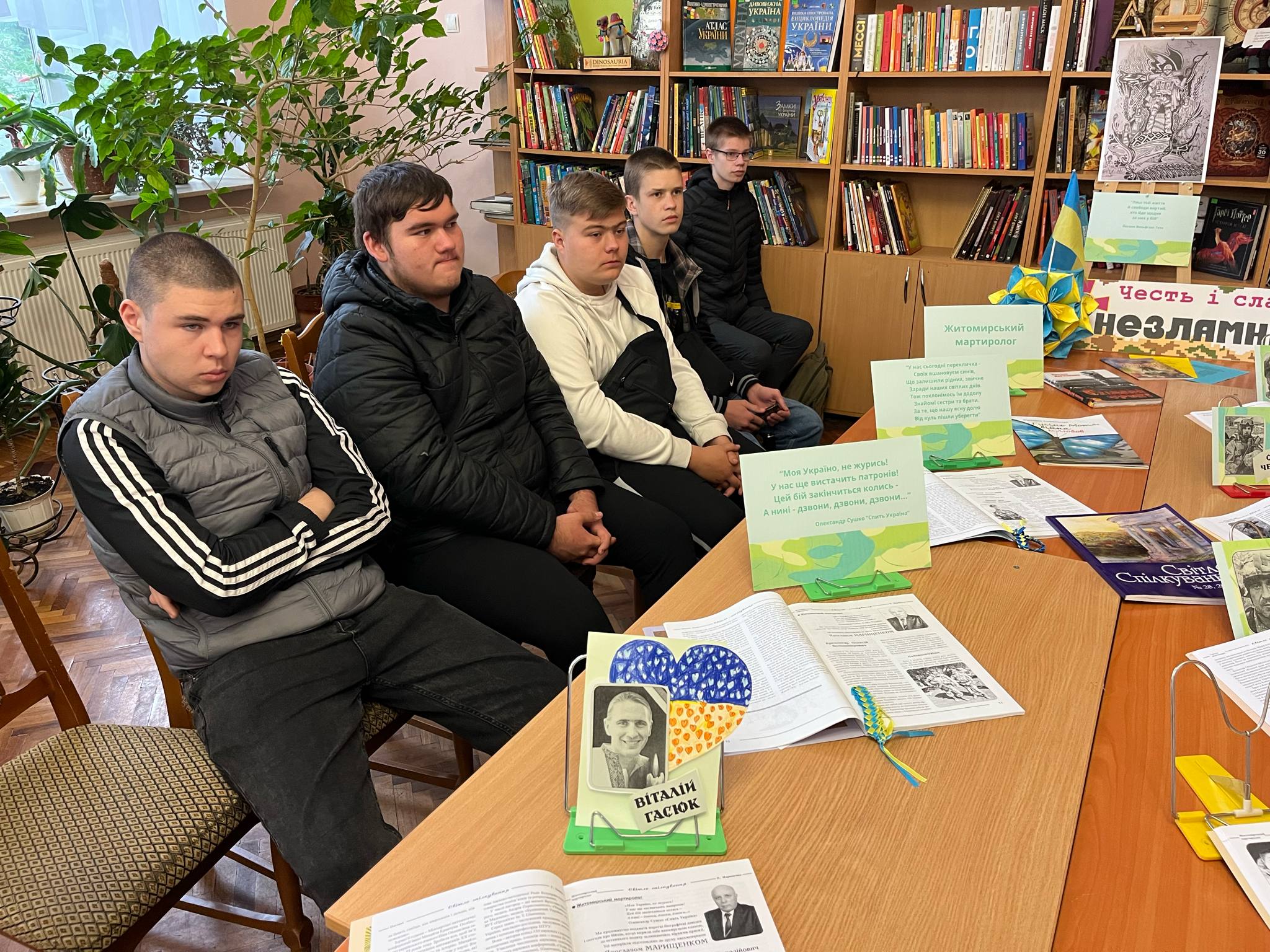 На алеї Героїв «Честь і слава незламним!» бібліогіди, використовуючи друковані джерела, що є у фонді бібліотеки, знайомили студентів гр.1Р-1157, класний керівник Тетяна РИБАЧОК, та 1Д-1153, класний керівник Марина Кіпчук, Житомирського автомобільно-дорожнього фахового коледжу Національного транспортного університету з Воїнами світла, нашими земляками, щоб пам’ять про них надовго збереглася в серцях та спогадах полісян.