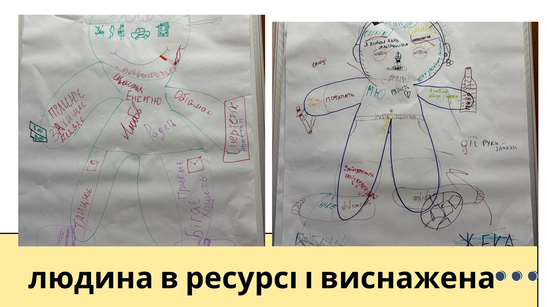 - Ключова вправа «Силует людини»: Учасники в командах детально описували стани людини, яка перебуває в ресурсі, та людини виснаженої (думки, емоції, дії). Це дало змогу краще розпізнавати власні психологічні сигнали.