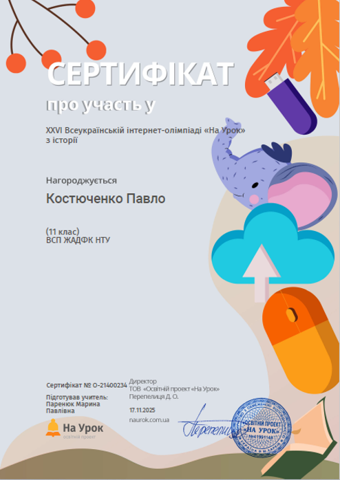 Студенти Коледжу під керівництвом викладача Марини Паренюк взяли участь у ХХVІ Всеукраїнській інтернет-олімпіаді з історії від освітньої платформи На урок, яка відбулася протягом жовтня-листопада 2025 року. В олімпіаді взяли участь 11 здобувачів освіти.