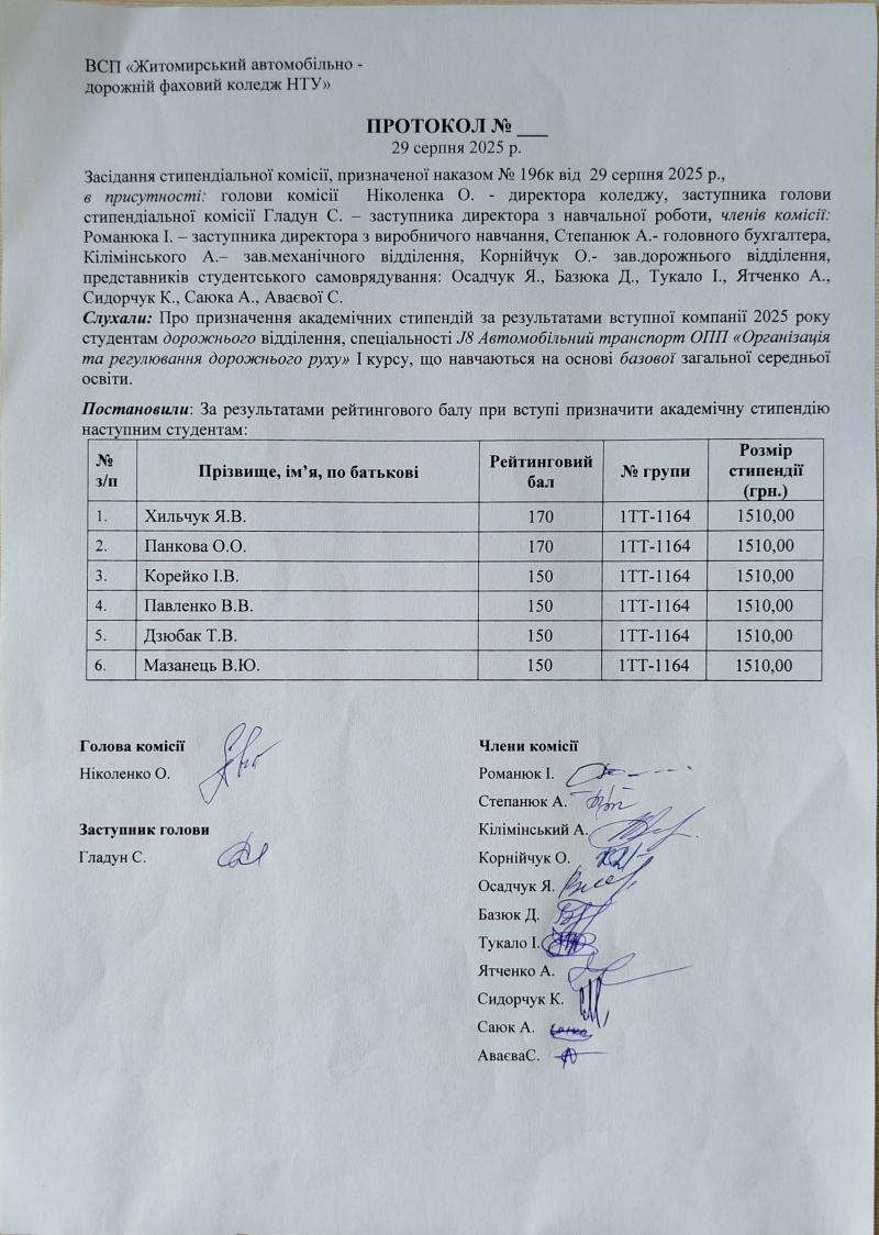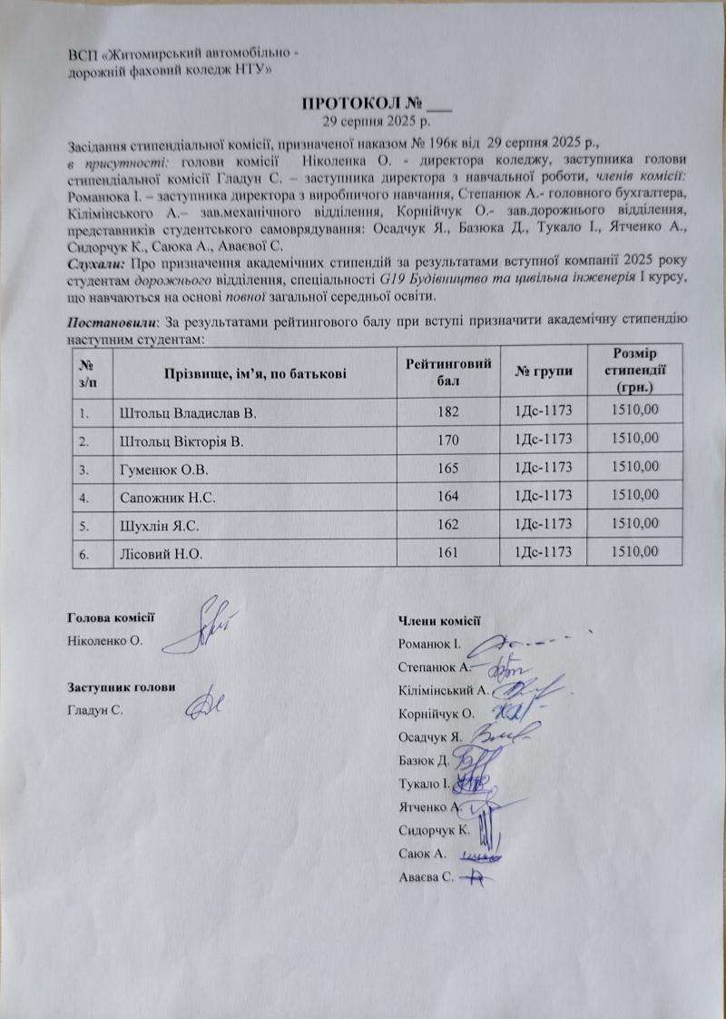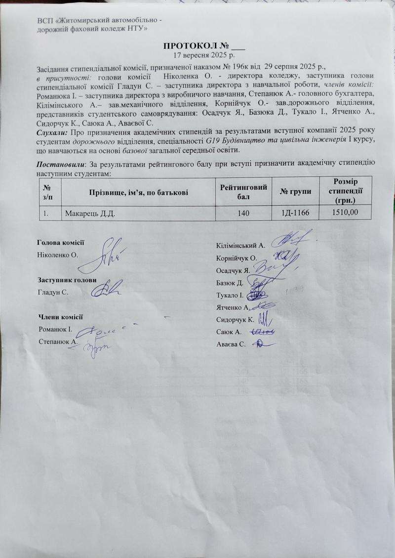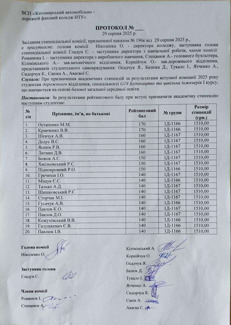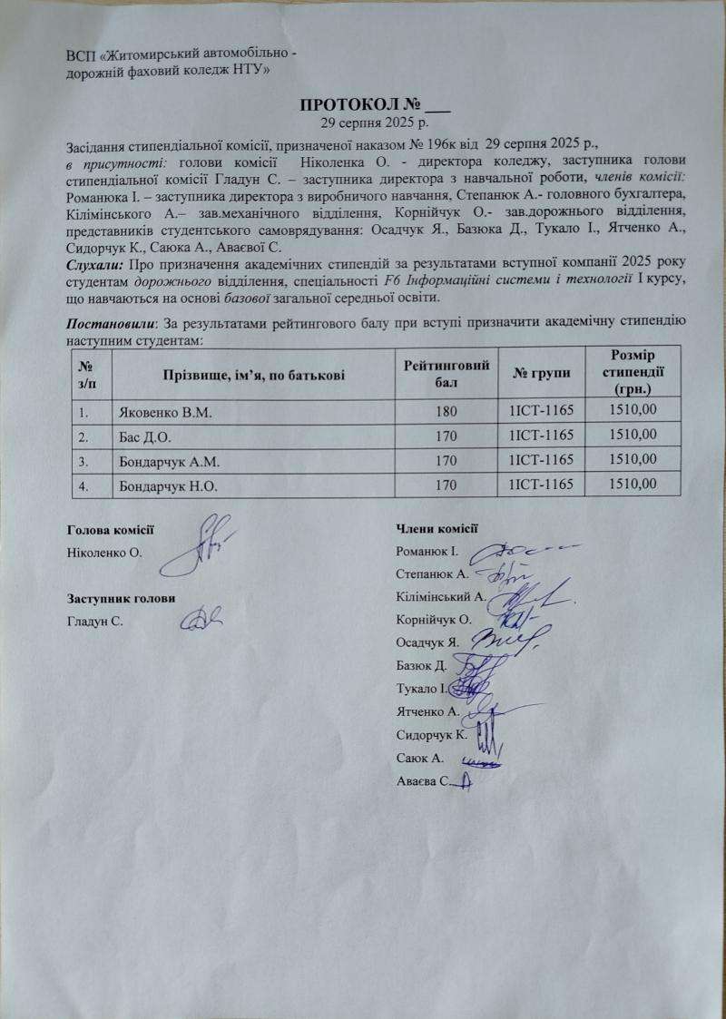 Протоколи призначення академічної стипендії за результатами вступної компанії