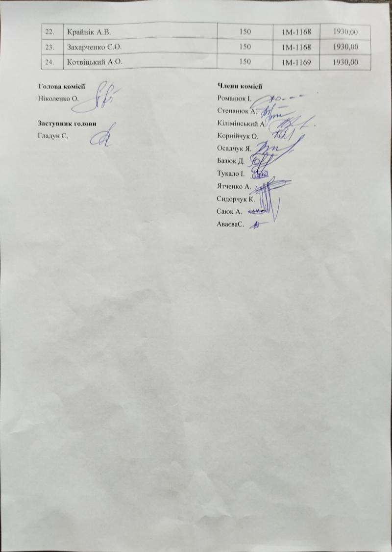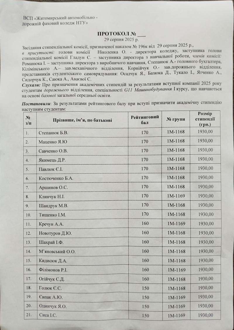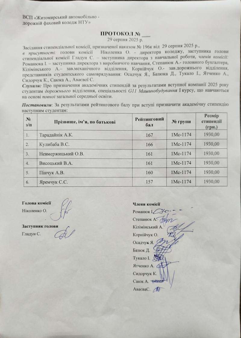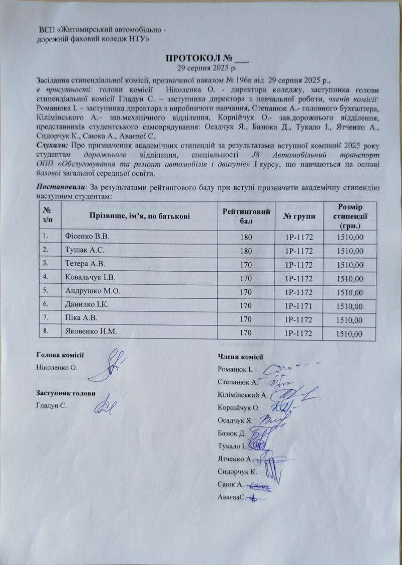 Протоколи призначення академічної стипендії за результатами вступної компанії