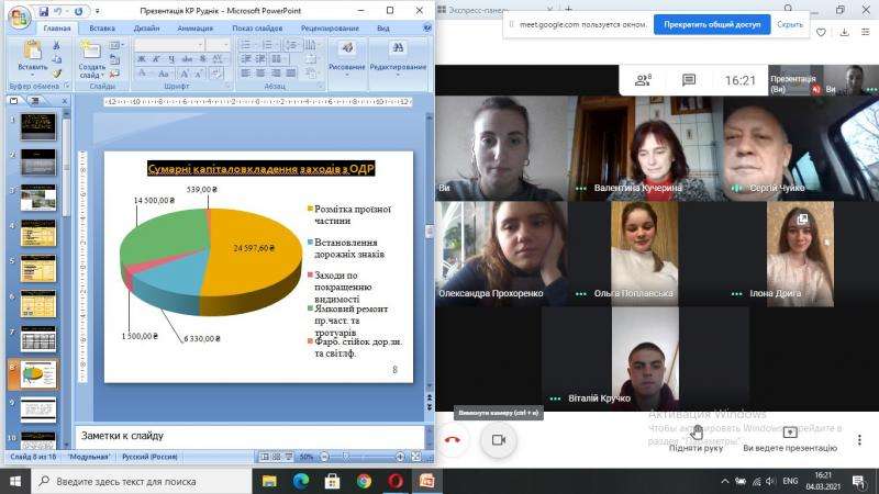 4 та 5 березня 2021 року відбувся захист курсових робіт з дисципліни "Економіка та планування організації дорожнього руху" (викладач В.Кучерина), спеціальність 275 Транспортні технології (на автомобільному транспорті), група 4ТТ-1053.
