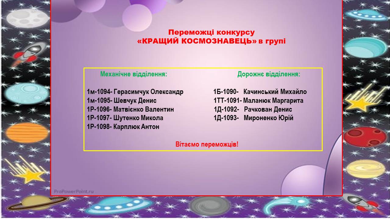 Команди виборювали звання «Кращий космознавець», «Краща космогрупа», «Краще космовідділення». До участі долучилось багато студентів. Запекла боротьба точилася за звання «Краща космогрупа». На початку конкурсу лідирувала група 1Р-1096. Але штурман команди 1Д-1093 Кіпчук М.А. вміло спрямувала своїх підопічних, які змагалися за принципом «Гуртом… бити добре». Другого дня дана група захопила лідерство, але активізувалися команди 1М-1095 та 1М-1094, які практично йшли в одну ногу. Під кінець дня суперництво було саме між цими трьома командами. Лише трішки балів відділило перше місце від другого та третього! Слід зазначити, що студентам довелося боротися також і з «природньою стихією»- погане технічне забезпечення Google Classroom. Але кмітливість та витримка багатьох учасників дозволили побороти труднощі.