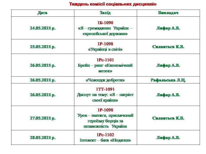 Тиждень циклової комісії соціальних дисциплін ВСП ЖАДФК НТУ з 24 по 28 травня 2021 року