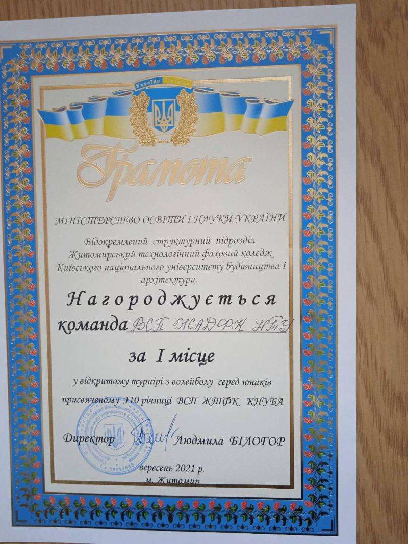 22 вересня 2021 року в спортивній залі ВСП "Житомирський технологічний фаховий коледж КНУБА" відбувся відкритий волейбольний турнір присвячений 110 річниці технологічного коледжу.