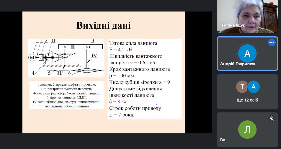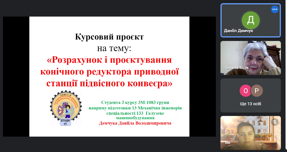 Студенти груп 3М-1082, 3М-1083 та 2Мр-1100 впродовж наступних декількох днів захищатимуть свої проєкти з дисципліни: «Деталі машин». На вибір студентів запропоновано дистанційну та очну форму захисту. Викладач Іщук Т.А. бажає студентам компетентно підійти до презентації своєї першої серйозної роботи.