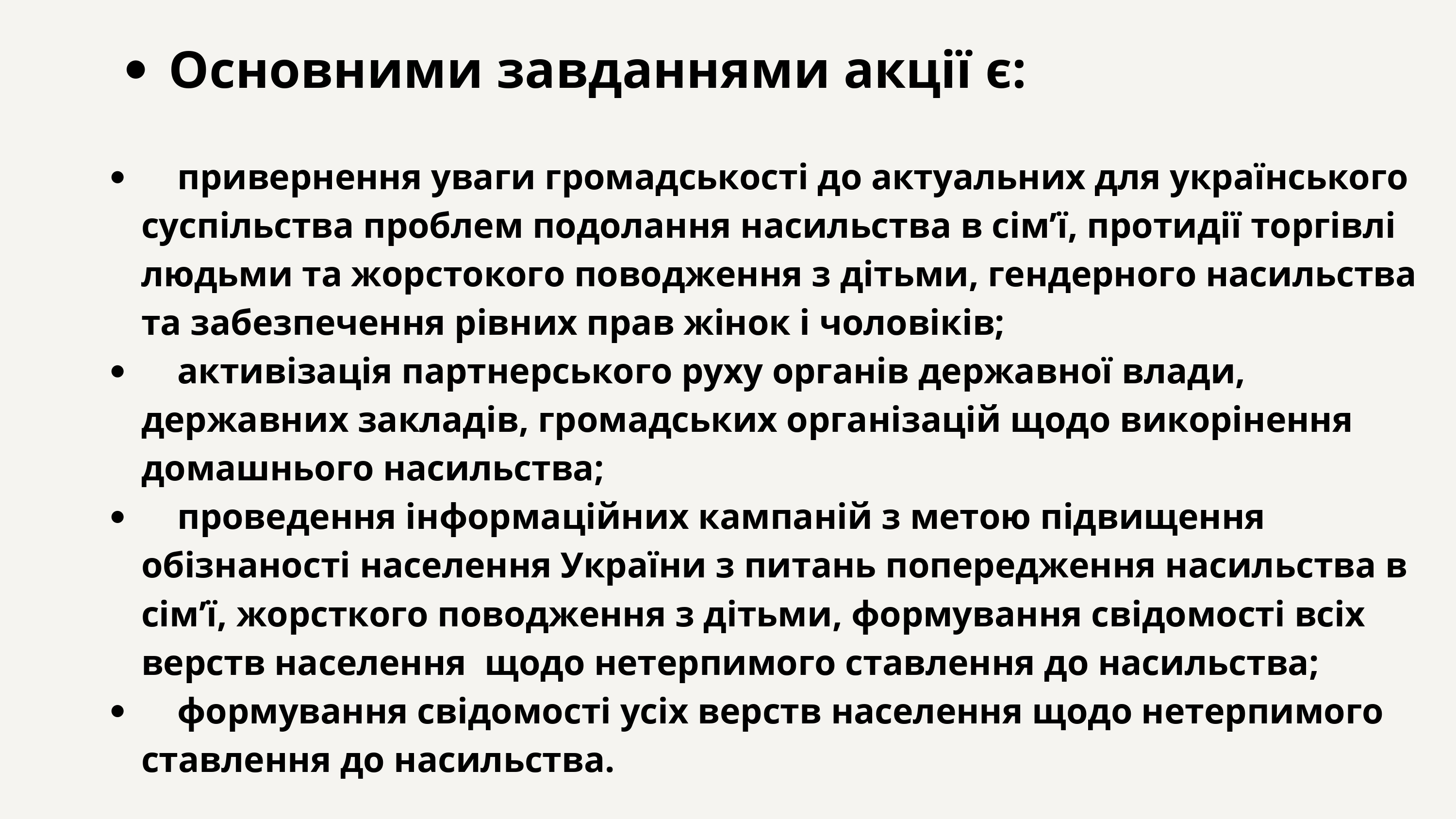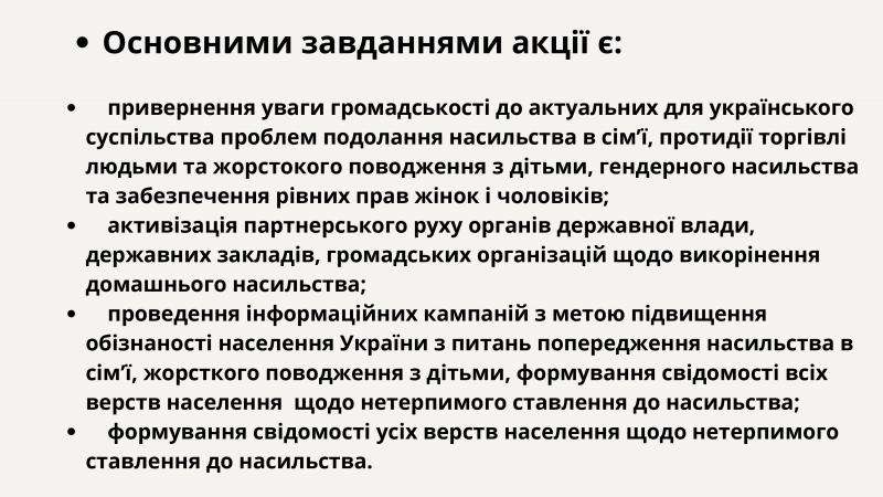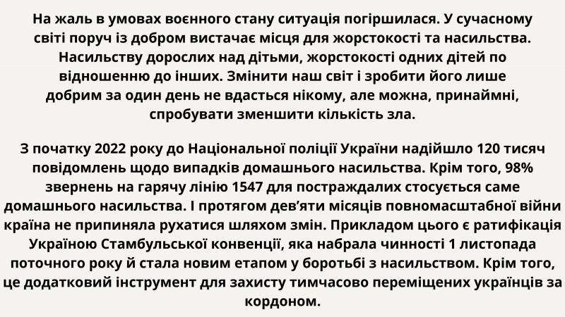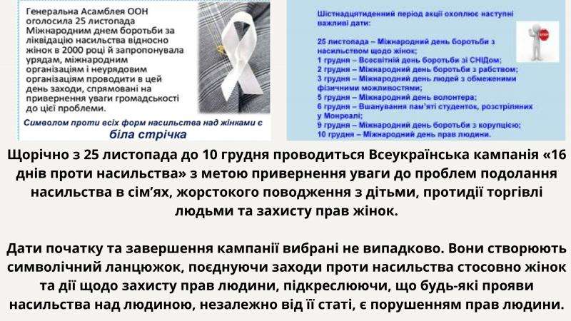 З 25 листопада по 10 грудня в Україні триває міжнародна акція «16 днів проти насильства». Ця щорічна міжнародна кампанія починається 25 листопада, у Міжнародний день боротьби за ліквідацію насильства щодо жінок, і триває до 10 грудня – Дня прав людини. З 1991 року акцію «16 днів проти насильства» підтримують у 100 країнах світу, щоб збільшити розуміння та обізнаність про всі форми насильства і створити соціальний простір, вільний від насильства.