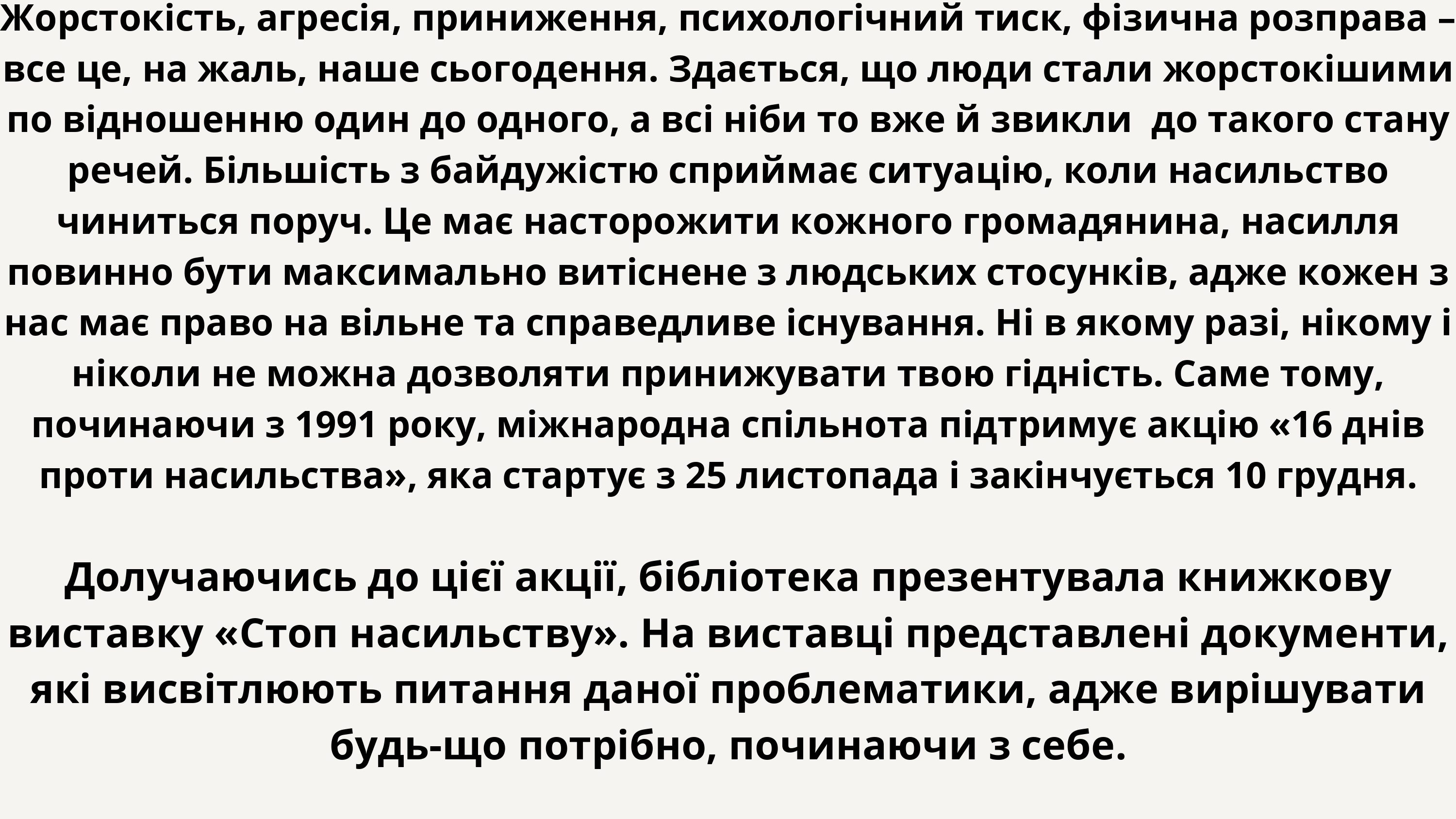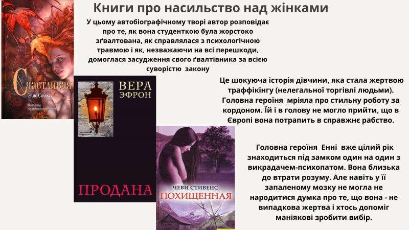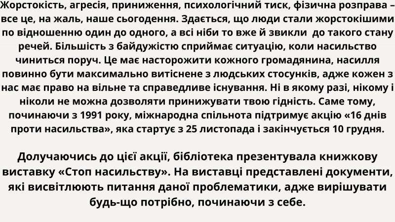 З цього приводу представлено книжкову виставку «Стоп насильству!». Метою виставки є привернення уваги користувачів бібліотеки до проблем насилля у суспільстві, адже найвищою цінністю будь-якої держави є людина – її життя і здоров’я, честь і гідність, недоторканість та безпека.