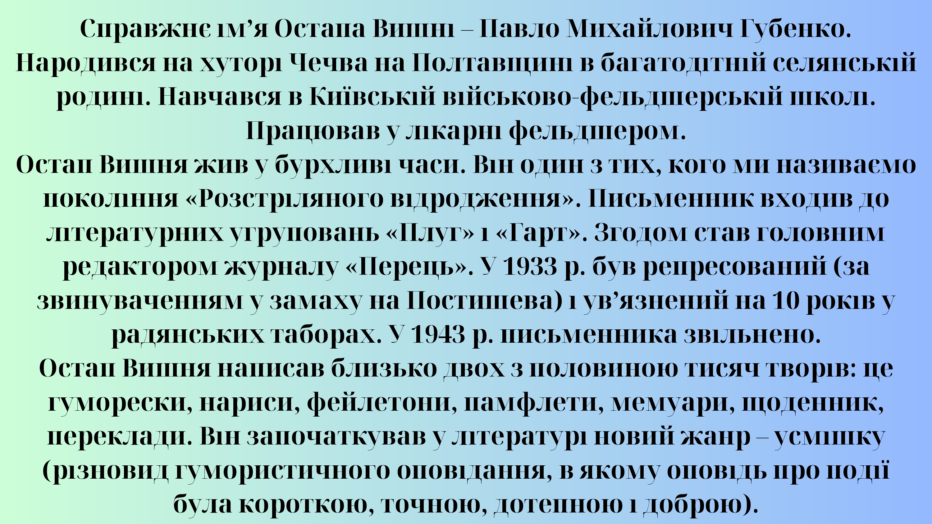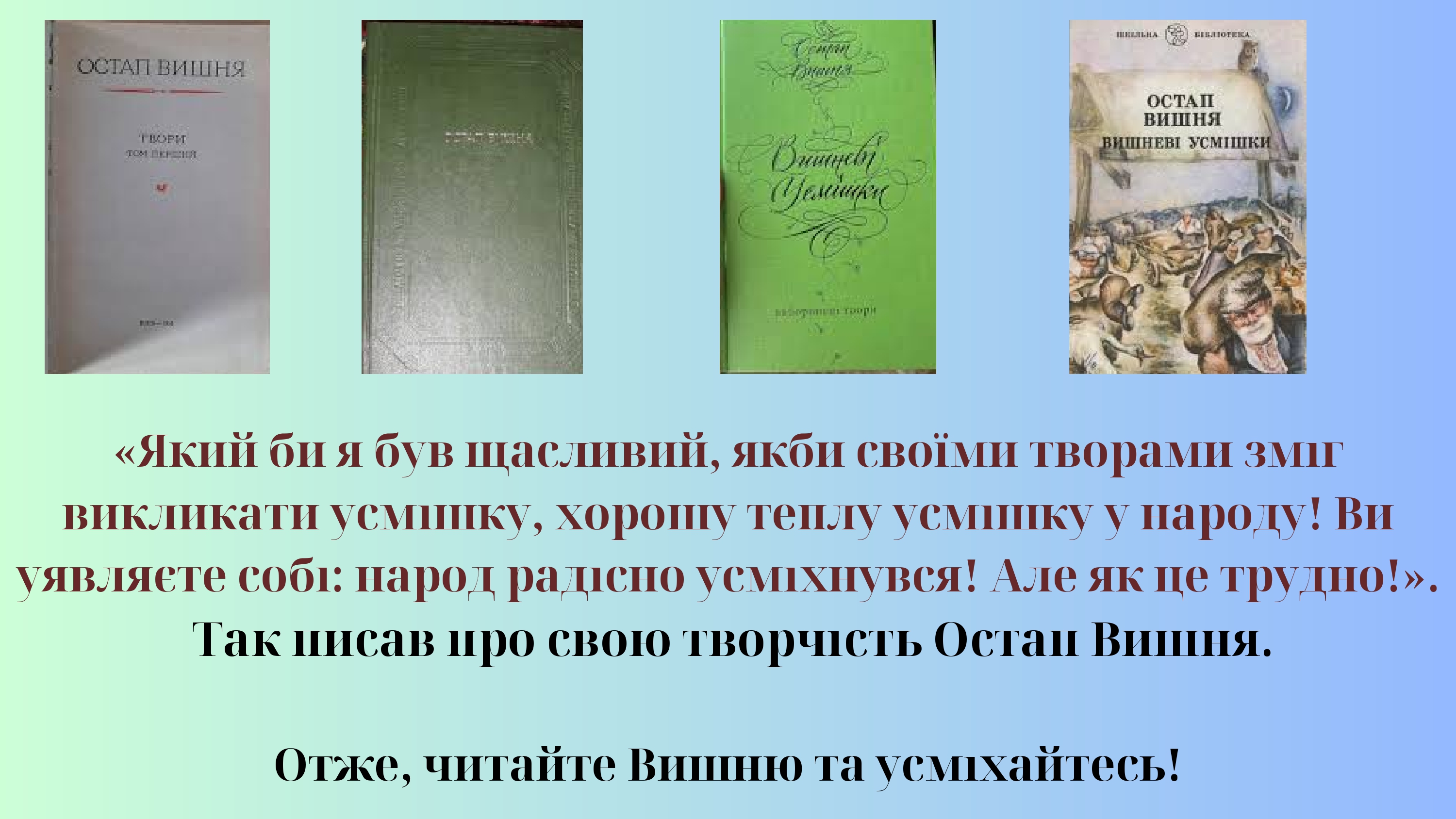 Остап Вишня – першопроходець жанру усмішки. Віртуальна книжкова виставка до дня народження відомого українського письменника і новеліста Остапа Вишні (Павло Михайлович Губенко)