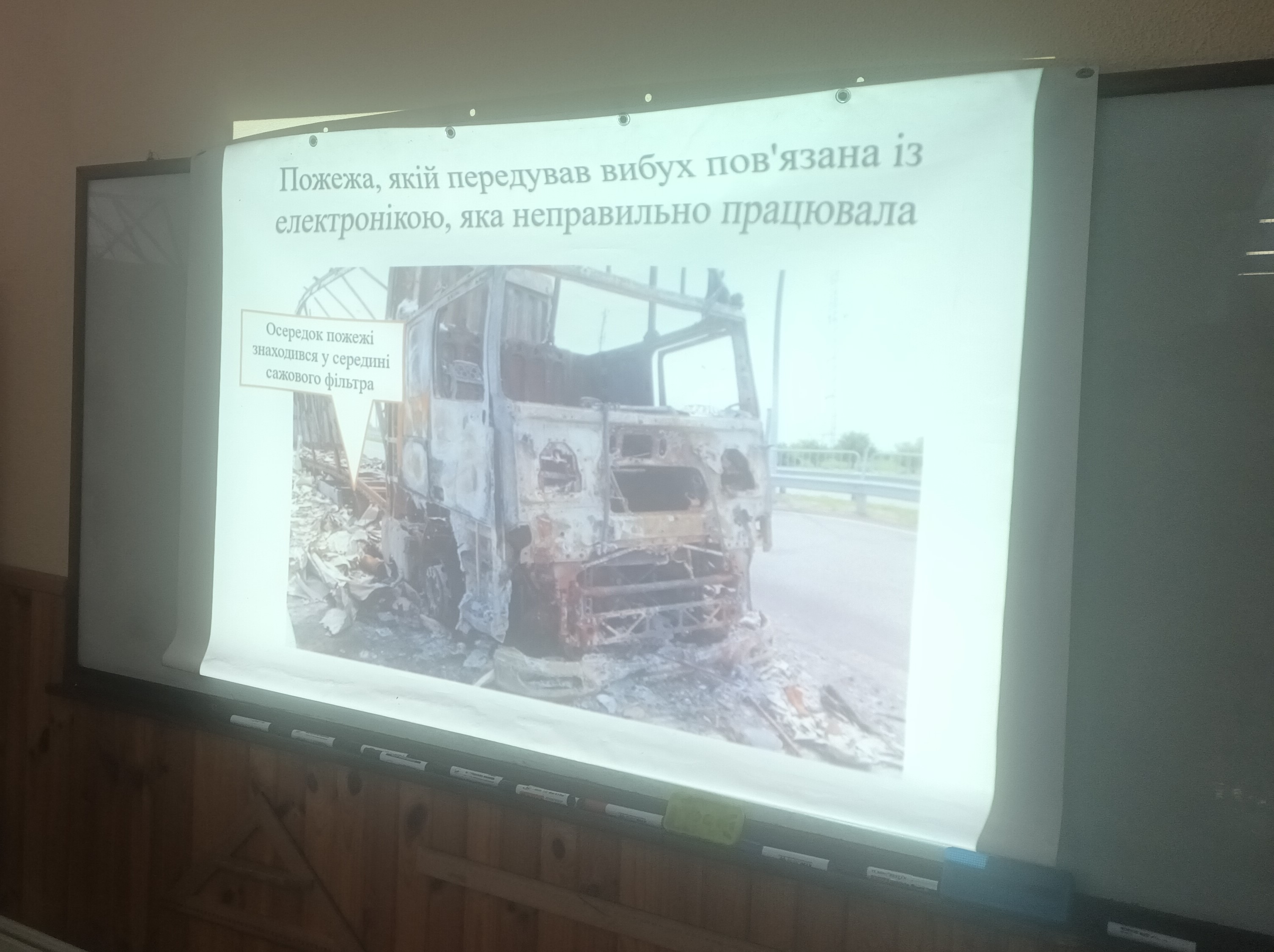Експерт зосередив увагу на особливостях експлуатації електромобілів, які призводять до аварійних ситуацій з системою електрозабезпечення. Констатував, що основною небезпекою електромобіля є загоряння внаслідок замикання, перегріву, несанкціонованого доступу до електросистеми і, як наслідок, її порушення. Продемонстровані приклади експертних досліджень з випадками загорянь батареї внаслідок аварійних ситуацій і пошкодження батареї та днища автомобіля під час експлуатації. На завершення зустрічі на питання лектора найзмістовніші відповіді студентів були відзначені коштовними подарунками.