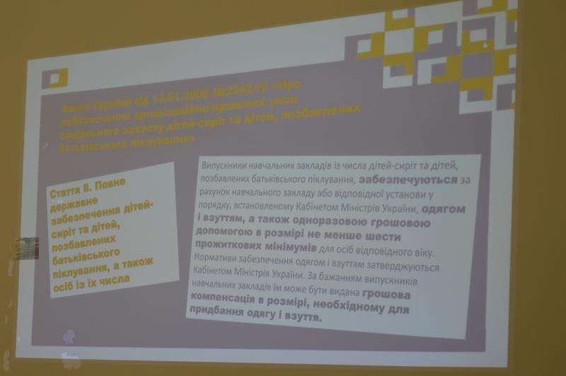 Учасникам семінару були висвітлені теми про законодавство України, яке регламентує захист прав, про дотримання вимог законодавства України дітей-сиріт, дітей, позбавлених батьківського піклування та осіб з їх числа в наш час. Було наголошено про права дітей-сиріт та дітей, позбавлених батьківського піклування: