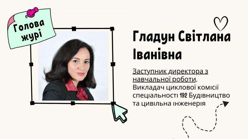 - Світлана ГЛАДУН - заступник директора з навчальної роботи, викладач циклової комісії спеціальності 192 Будівництво та цивільна інженерія,
