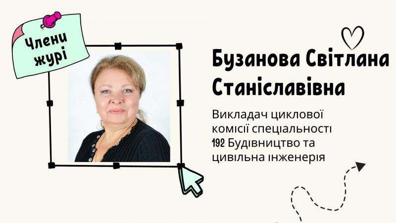 - Світлана Бузанова - викладач циклової комісії спеціальності 192 Будівництво та цивільна інженерія.