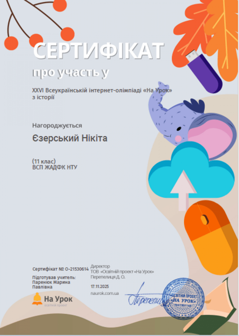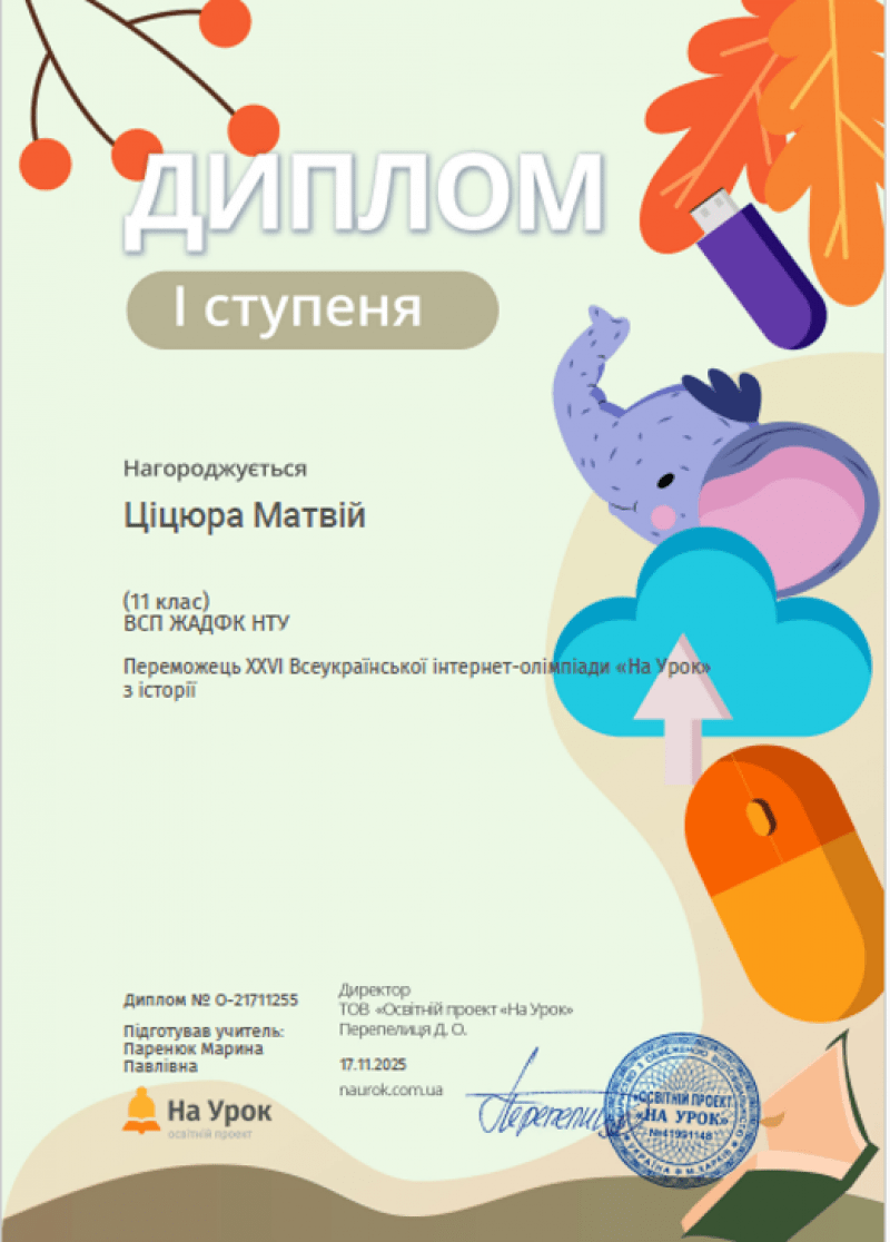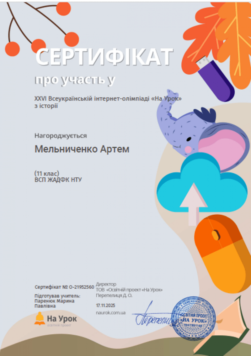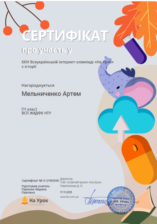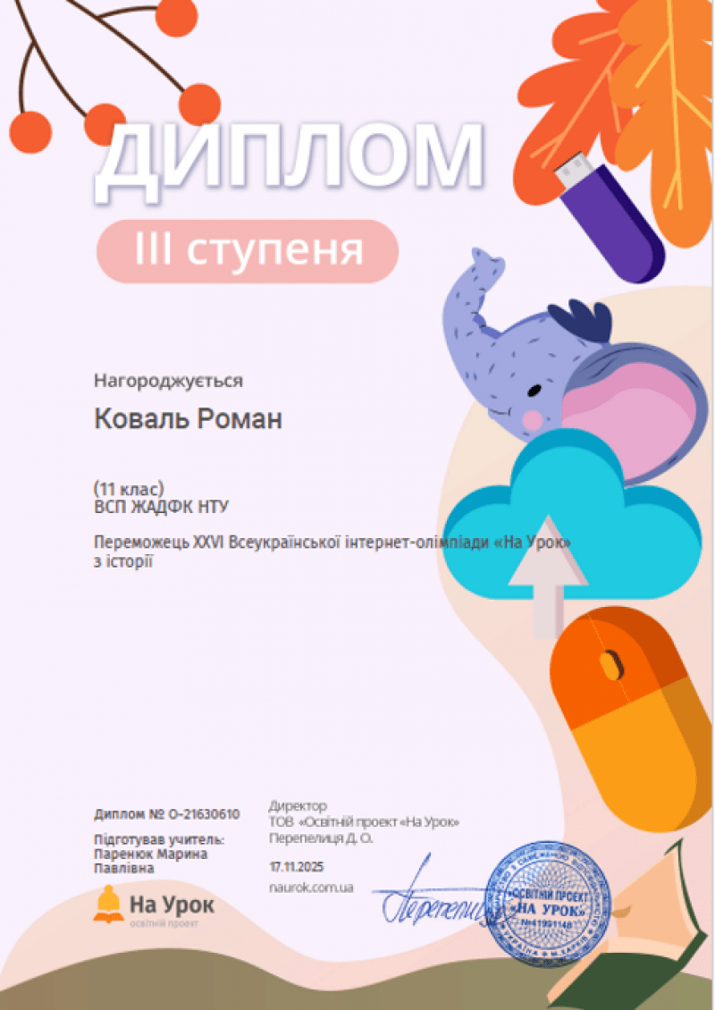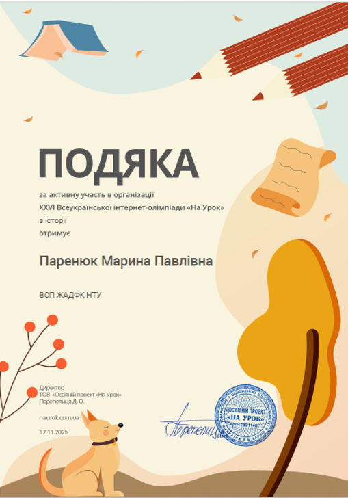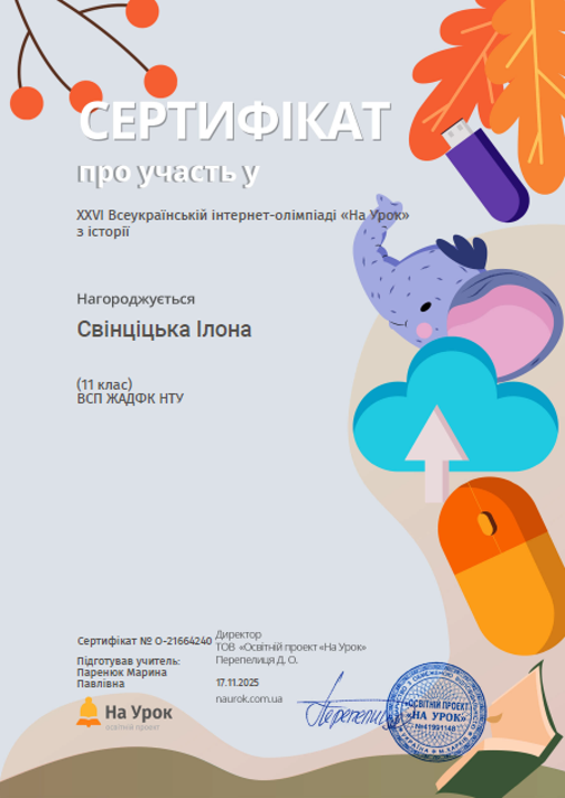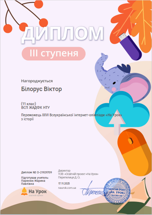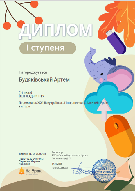 Студенти Коледжу під керівництвом викладача Марини Паренюк взяли участь у ХХVІ Всеукраїнській інтернет-олімпіаді з історії від освітньої платформи На урок, яка відбулася протягом жовтня-листопада 2025 року. В олімпіаді взяли участь 11 здобувачів освіти.