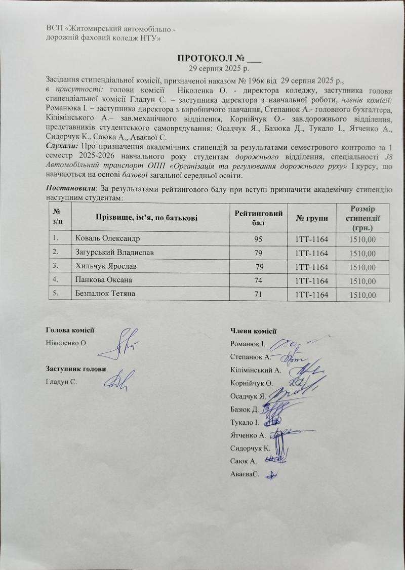 Протоколи призначення академічної стипендії за результатами вступної компанії